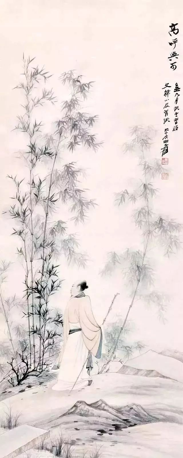 其竹荫高士图系列作品,往往只一人,或持杖而立,或笠屐疾行,或默坐沉思,或野外行吟,或伏案默读、神态自若,真乃一竹一人一画境,一念一品能修心!